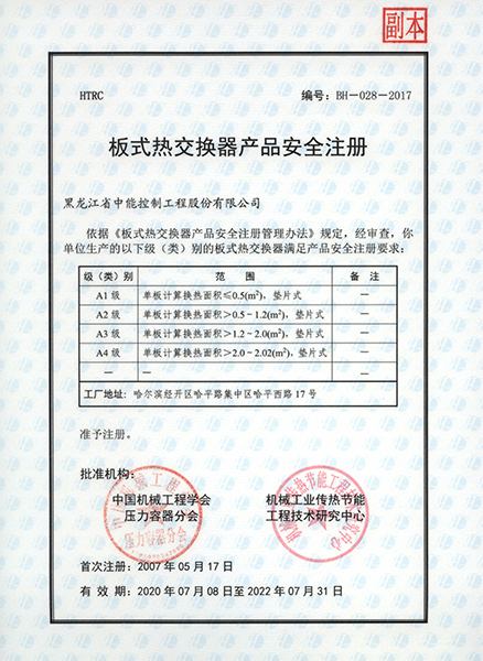 2007年獲得國家板式換熱器產(chǎn)品安全注冊證書,并被批準(zhǔn)為國家級高新技術(shù)企業(yè)